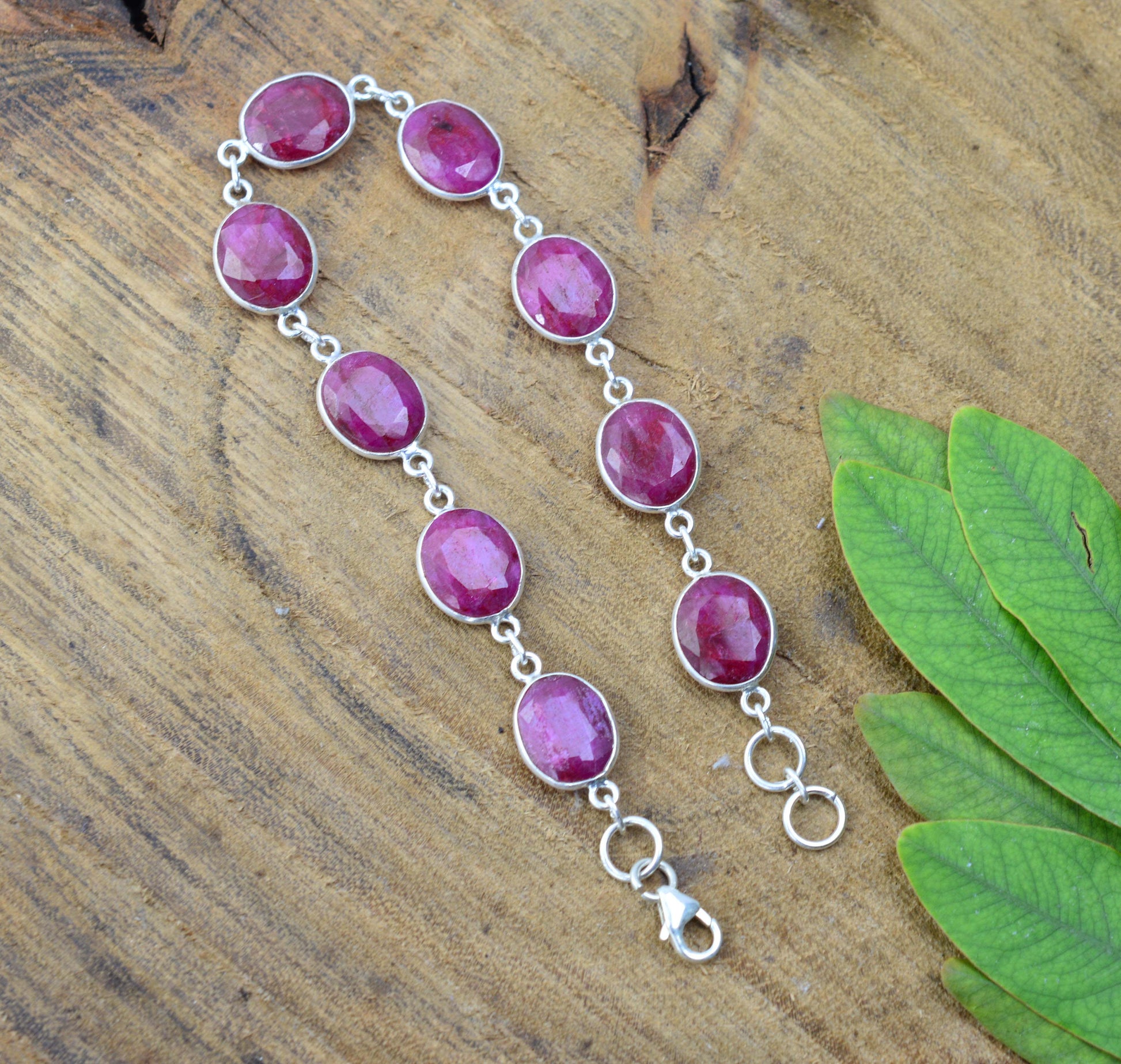 925 SOLID STERLING CUT Simulated Ruby HANDMADE BRACELET- 8 INCH