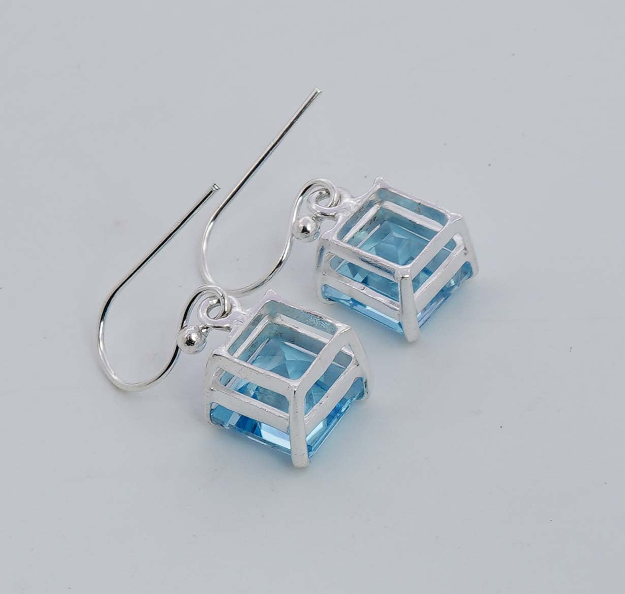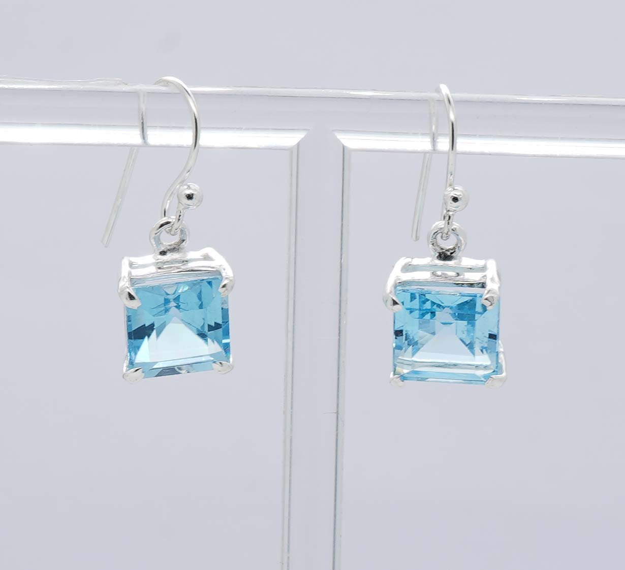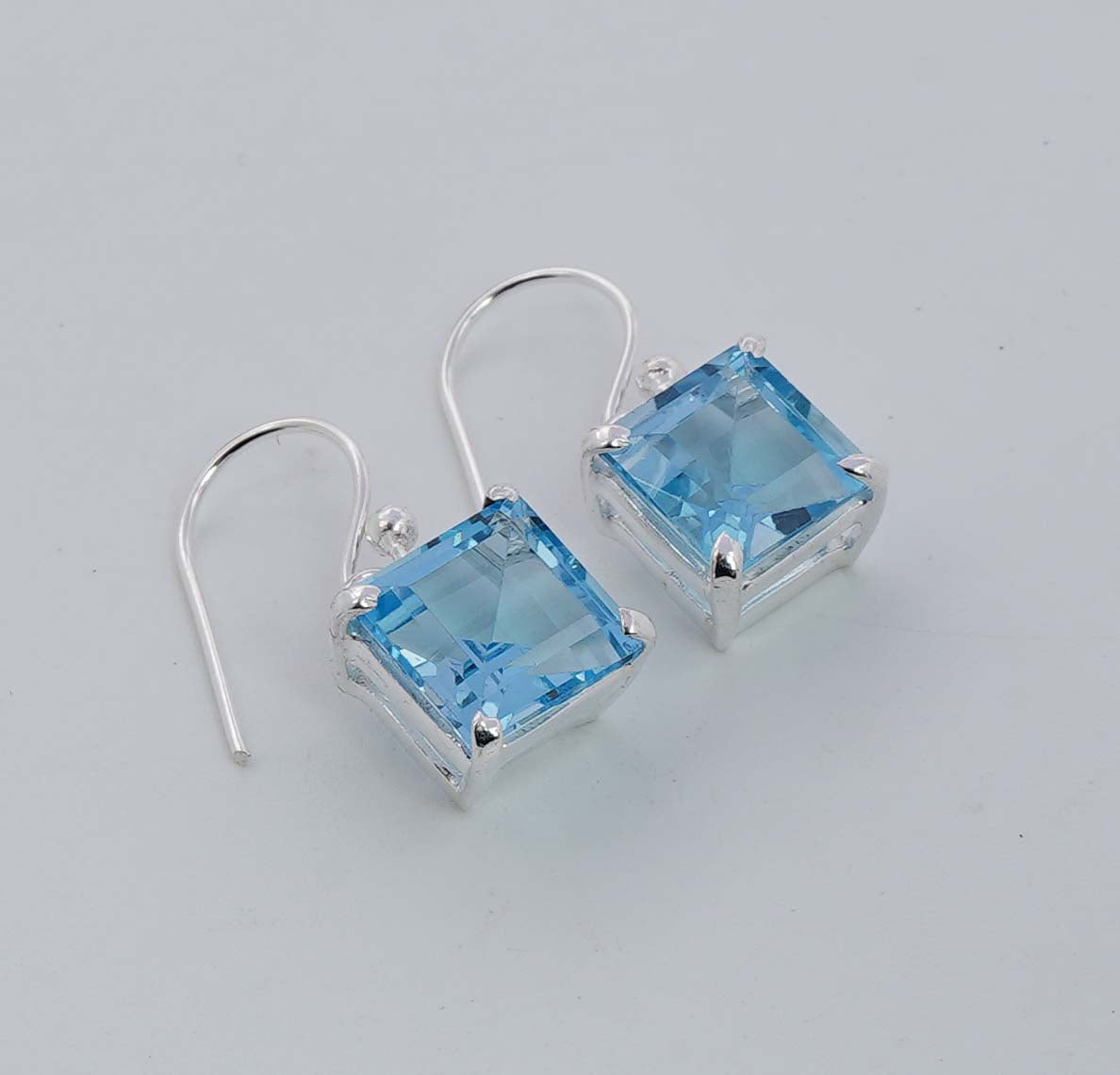925 Solid Sterling Silver Faceted Blue Topaz Prong Setting Hook Earring - 4.4 Grams